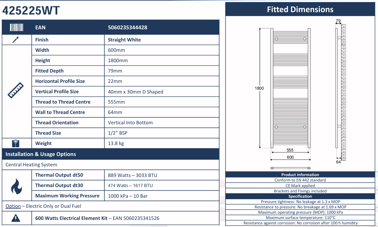 The Avanti Heated Towel Rail is manufactured to EN 442 standards, CE marked, and supplied with robust brackets and fixings for secure installation. Each unit is pressure tested to ensure no leakage at 1.3 times the maximum operating pressure and no breakage at 1.69 times MOP. With a maximum surface temperature of 110°C and strong corrosion resistance proven after 100 hours of humidity testing, this towel rail guarantees reliable, long-lasting performance for modern bathrooms.
